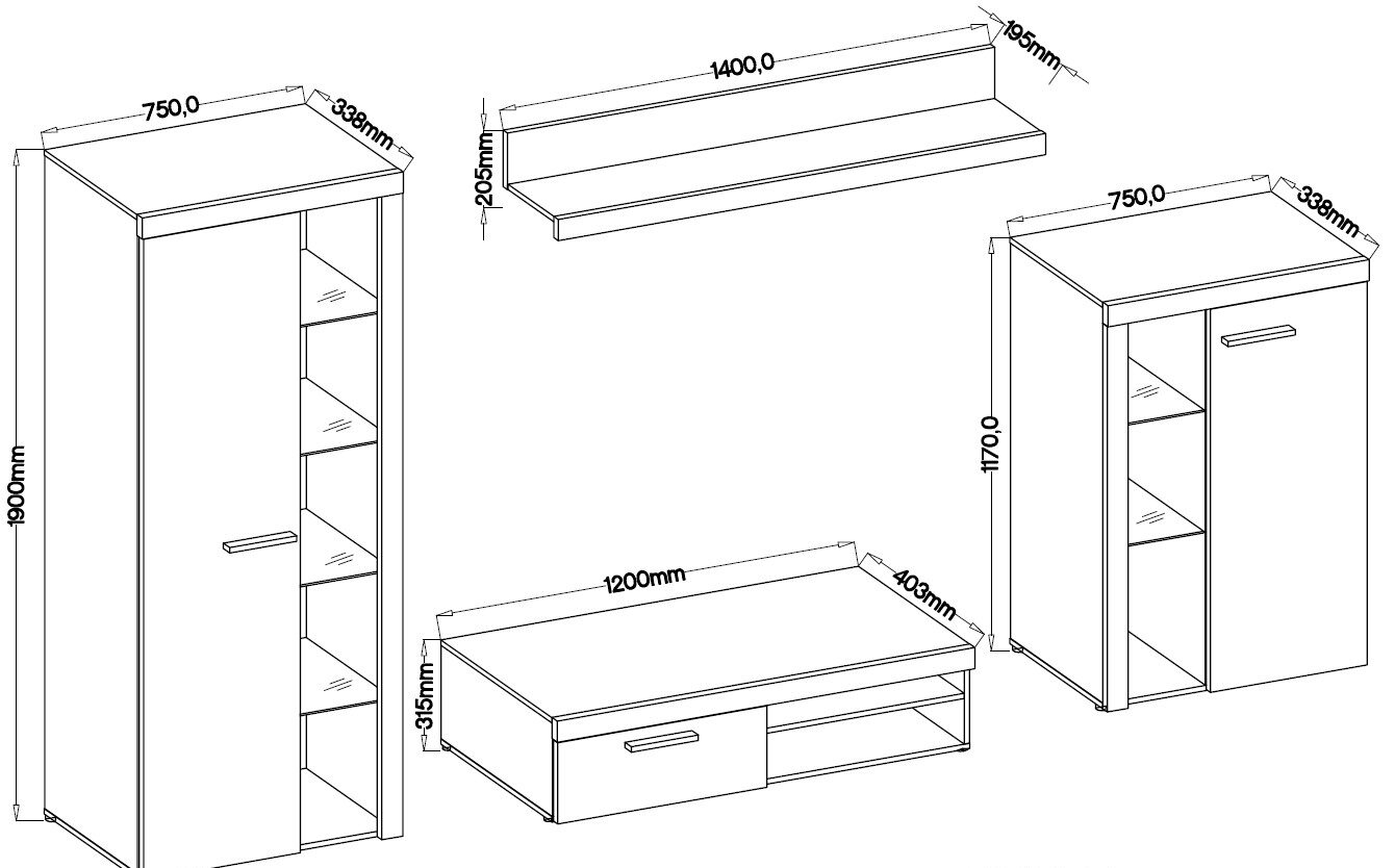 Meblościanka MALEO  wyróżnia się nowoczesnym designem oraz przemyślanym układem, który ułatwia przechowywanie i eksponowanie dekoracji. Korpus oraz fronty zostały wykonane z obustronnie laminowanej płyty o grubości 15–16 mm, co zapewnia trwałość całej konstrukcji oraz łatwe utrzymanie jej w czystości. Krawędzie mebla zostały wykończone odporną na uszkodzenia okleiną, która dodatkowo podnosi estetykę wykończenia.